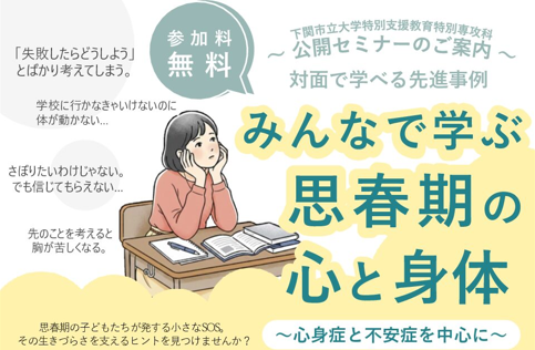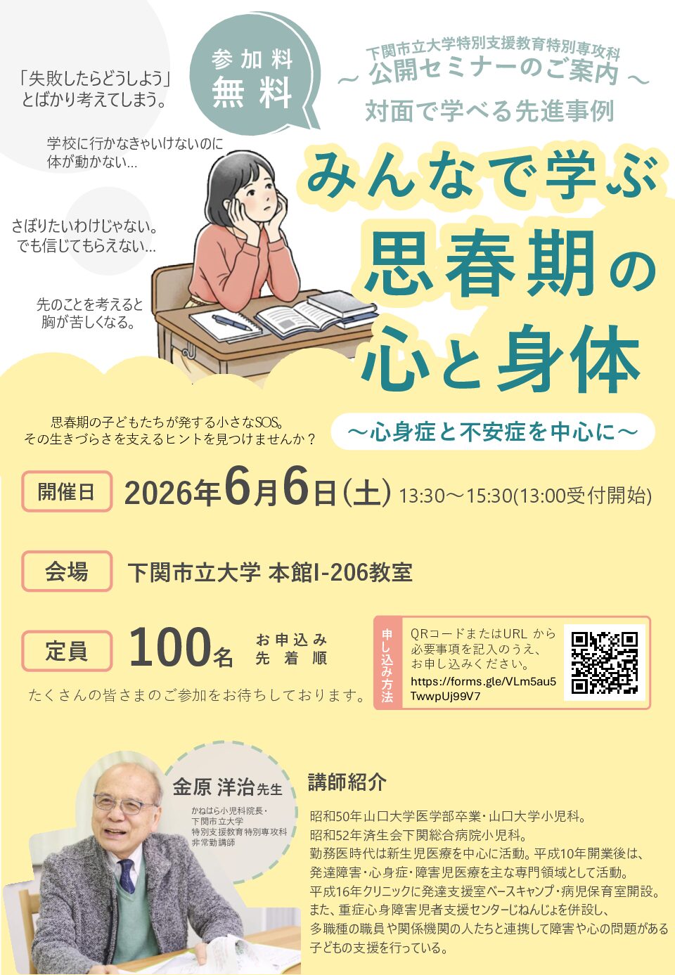 院長講演:令和8年6月6日(土) お知らせ 2026.04.17 令和8年6月6日(土)13時30分から下関市立大学にて、院長が「思春期の心と身体」について講演します。参加費は無料です。詳細はチラシをご覧ください。